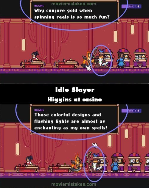 Trivia: There is a small random chance that you will find Higgins inside the Slayer Casino standing next to the slot machines. This is actually an easter egg where he will just be there sometimes. If you return to his tower, he will also still be there. If you talk to him at the casino, he will talk about why conjure gold with a spell when he can use the slots, and talks about the flashing colours being enchanting.