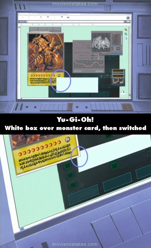 Continuity mistake: When Kaiba is on his computer and discovers the Winged Dragon of Ra's secret special power, there is an image of the Winged Dragon of Ra card on his monitor screen. A rectangular white box appears on the monitor, covering the bottom right corner of the dragon card. In a closer shot of the monitor, it is now switched; the corner of the dragon card is now covering the rectangular white box. (00:10:15)