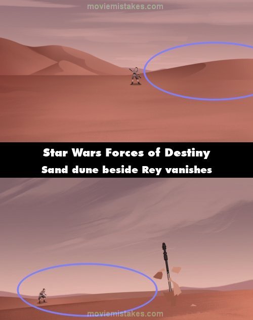 Continuity mistake: In the shot where Rey throws her staff and it lands hitting the sandworm, the large sand dune that was to her left has disappeared when it was there a couple of shots before. And she did not turn her body, only her head looking around. (00:01:43)