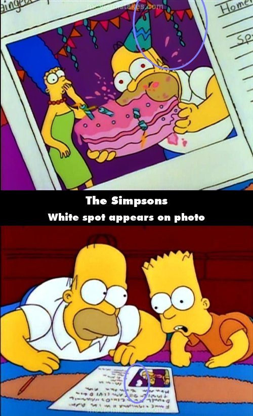 Continuity mistake: Homer puts his photo on his application, and there is no white spot behind his head in the picture. When the shot changes, there is now a white patch in the photo. (00:06:00)