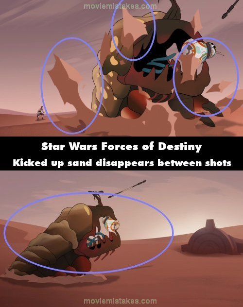 Continuity mistake: When the sand worm is punching up out of the sand to spit BB-8 out, several globs of sand are spraying in the air around it. In the side shot, the sand kicked up in the air has vanished. (00:01:51)