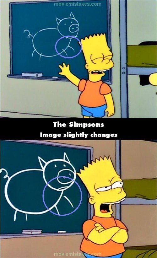 Continuity mistake: When Bart runs his nails down the chalkboard, the image on the board changes slightly; note the legs. There is a gap between one leg and the body in one shot, but not the other. (00:14:00)