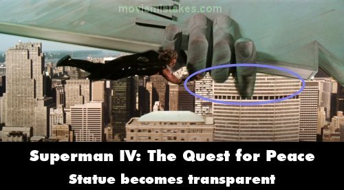 Revealing mistake: When Nuclear Man carries the Statue of Liberty, its fingers turn semi-transparent, revealing the buildings behind.