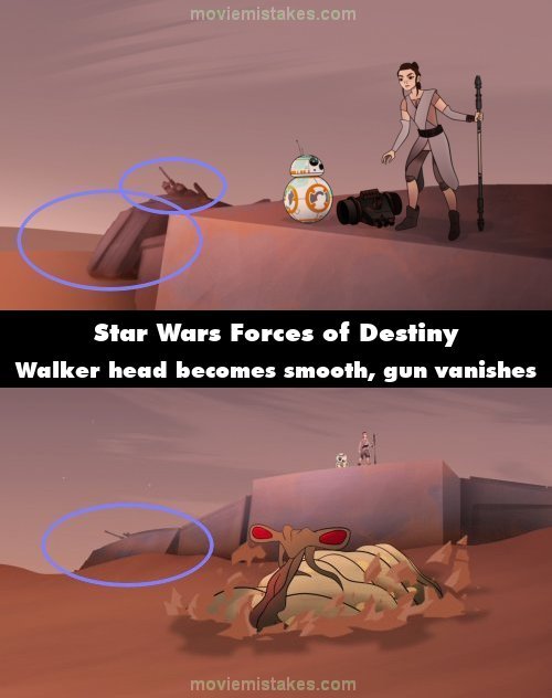Continuity mistake: The head of the AT-AT Walker that Rey gets on to escape the sand worm is shown twice. In the second shot, as the sand worm is leaving, the details on top of the Walker's head have vanished. The outward square protrusions and ridges are now a flat surface on the Walker's head. And one of the parts of its front-facing gun has disappeared. (00:02:24)