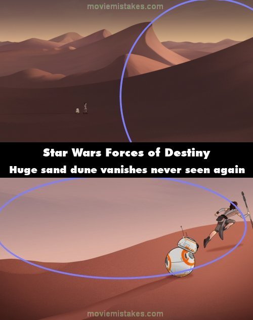 Continuity mistake: In the very first shot of the episode, Rey and BB-8 are walking in the sand, and she is coming up on a giant sand dune to her left before her. Other large sand dunes are also visible in the background. Yet after that first shot, none of the massive dunes are ever seen again, and when they encounter the sand worm, all the dunes around them are significantly smaller. (00:00:23)