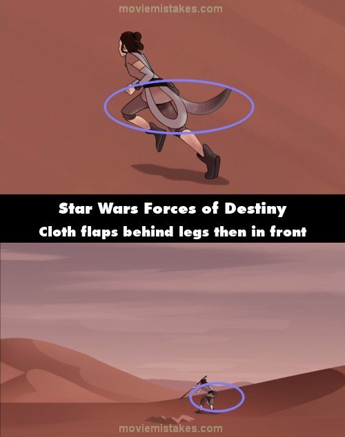 Continuity mistake: For most of the episode, Rey's outfit is shown having long pieces of fabric or cloth hanging off the back of her clothes like robe flaps and one in a sort of loop. Usually, when she's running or moving, these are flapping or blowing around behind her as you'd expect. Yet strangely, when she's running up to the spot where the sandworm just grabbed BB-8 and went under, the flaps are staying in front of her legs as she runs, but as she stops and the camera cuts, they are behind her again. (00:01:34)