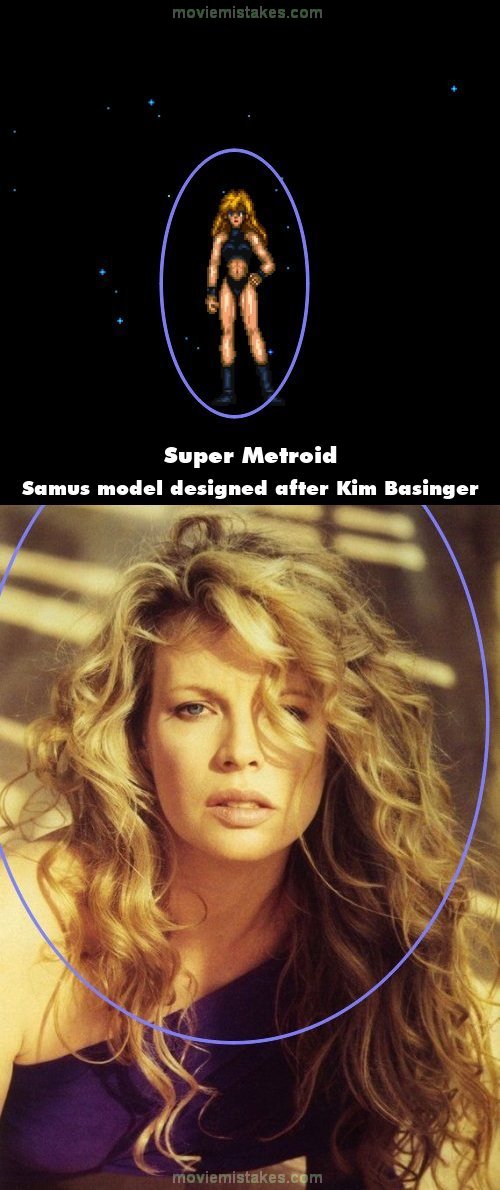 Trivia: It's common in Metroid games for Samus to remove her power armor at the end of each game if the player beats the game fast enough or meets certain goals. Even as far back as the original Metroid. With the graphical improvements of the SNES, when coming up with how Samus would look at the end of Super Metroid when shown in a bikini, Nintendo decided to base her looks and face around popular 90s actress Kim Basinger, who was popular and known to most kids from the Batman movie.