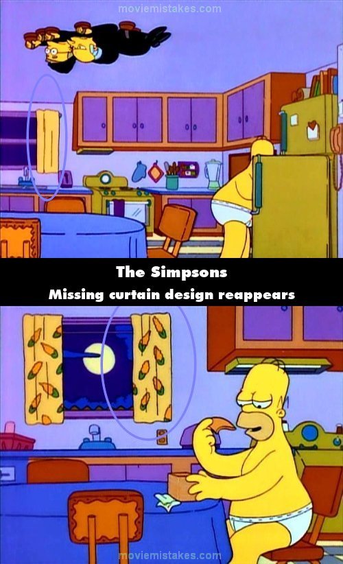 Continuity mistake: When Homer gets the cheese out of the fridge, the curtains are missing the design on them that reappears when he sits down with the cheese. (00:14:30)
