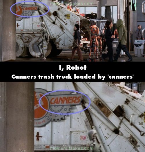 Trivia: When Spooner is walking the street after leaving his apartment at the beginning of the film, he looks over and sees a bunch of robots loading trash into a garbage truck that is labelled with the brand name Canners. Canner is a derogatory term for robots in this universe that Spooner even called one at his front door just moments before this scene. And here we see it is also a brand name of trash service. (00:03:55)