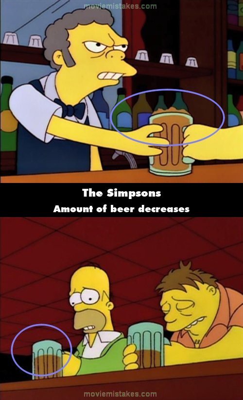 Continuity mistake: When Homer is in Moe's, Moe pours him a full pint. When it's passed to Homer, it's now 3/4 full in the glass. (00:10:40)