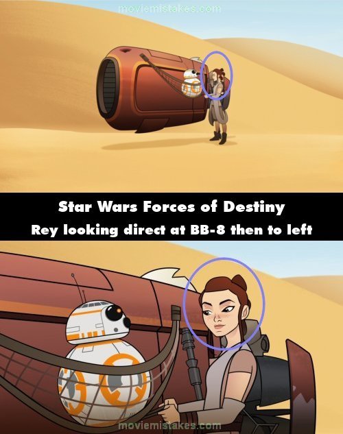 Continuity mistake: When Rey is tying BB-8 to the side of her speeder bike, she is looking directly at him in the further shot, then in the close-up has her head turned to the left. (00:00:21)
