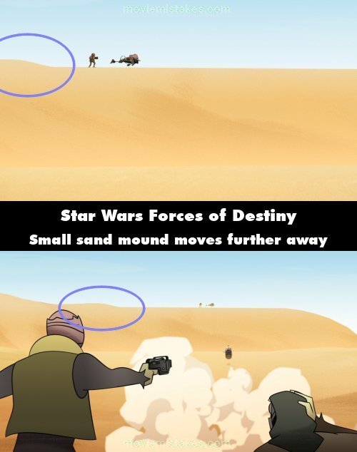 Continuity mistake: When Rey looks over her bike and spots Teedo, he is standing on top of a large sand dune with a smaller mound of sand close by on the left of the screen. A few shots later, after Rey is attacked by other scavengers, she rides off in Teedo's direction, and now suddenly that smaller mound of sand has moved much further away from him. (00:00:51)