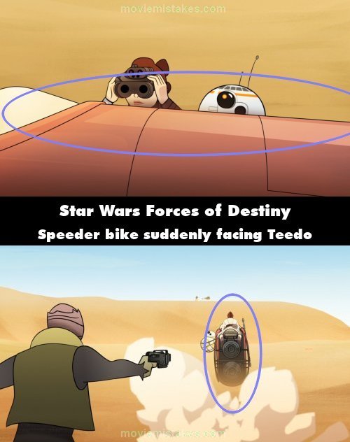 Continuity mistake: When Rey spots Teedo, she's looking over the side of her speeder bike towards him, with the bike facing 90 degrees to the left of where he would be. Then, when the other thugs attack Rey, she jumps on her bike and takes off, moving forward without turning her bike at all, and suddenly she's driving it straight at Teedo, despite it facing 90 degrees to the left moments in the previous shot. (00:00:50)
