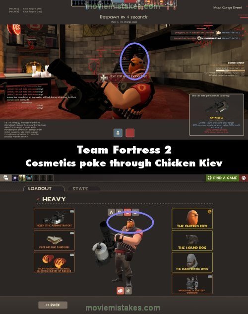 Revealing mistake: Cosmetic: When using the Chicken Kiev on Heavy, a lot of other cosmetics will clip through it. Like beards, glasses, and some hats poking through the chicken head.