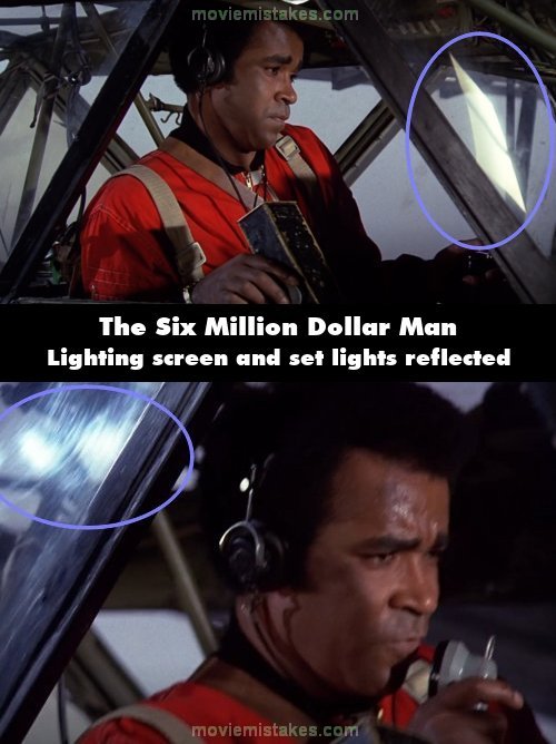 Visible crew/equipment: A large white lighting screen is reflected in the plane's windshield, as well as set lights that are reflected on its side.