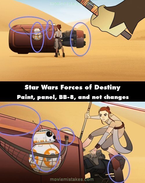 Continuity mistake: When Rey is jumping on her speeder bike to get away from the raider shooting at her, the paint on the back fin changes between shots again. And the top panel on the bike suddenly becomes much smaller and moves forward, and BB-8's position as well as the net change where they are on the side of the bike. (00:00:48)