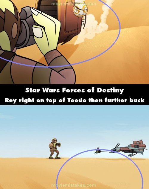 Continuity mistake: When Rey is moving directly towards Teedo on her speeder, she is shown getting right up on top of him a mere feet away before Teedo realises. Then, in the next shot, he suddenly has time to lower his scope, explain loudly, and then jump out of the way, with Rey much further back, allowing him time to move. But she was right on top of him before the angles changed. (00:00:56)