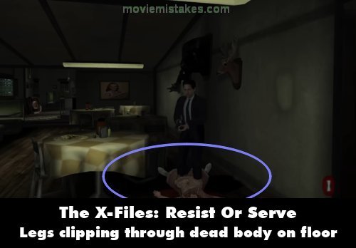 Revealing mistake: The player character can stand where your feet and legs are inside, clipping through the bodies of defeated enemies on the ground.