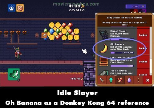 Trivia: One of the quests in the game is to kill 20,000 enemies using the Wind Dash. The name of this quest is "Oh! Banana," with the icon being a banana standing nearly on end. This is a reference to Donkey Kong 64 when the large Golden Bananas would appear and you'd hear DK's voice going, "Oh! Banana!"