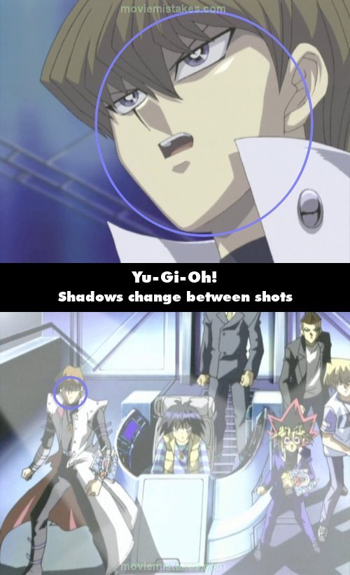 Continuity mistake: When Noah tells Kaiba it's time for everyone to get off the airship, there is a shot of Kaiba sarcastically asking, "Is that so? What if we don't?" where his face appears to be covered entirely in light. It then cuts to a wider shot where the right side of Kaiba's face and his eyes are covered in shadows. (00:08:50)
