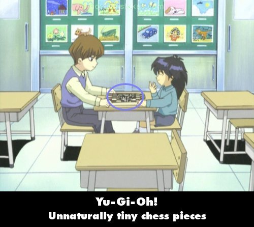 Revealing mistake: When younger, Kaiba and Mokuba are playing chess. There is a shot of them resetting the pieces on the chessboard to their original position so that they can play again. In the shot, the chess pieces are incredibly tiny and do not resemble real ones. (00:06:43)