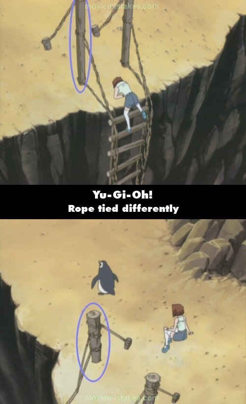 Continuity mistake: When Tea climbs to the top of the broken bridge, in the shot of her climbing back onto land, we can see that the bridge is held up by two wooden posts with rope tied around it. The rope is tied around the top, middle and bottom areas of the post. Later, when Tea begins to follow the penguin, the rope tied around the left post has changed position, now being tied at different areas of the post. (00:02:19 - 00:03:48)