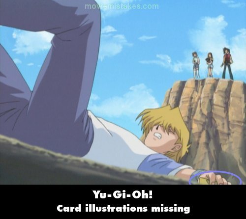 Revealing mistake: When Joey falls to the ground after being attacked by Hysteric Angel and his life points go down to 300, the cards in his hand are missing the illustrations. (00:04:36)