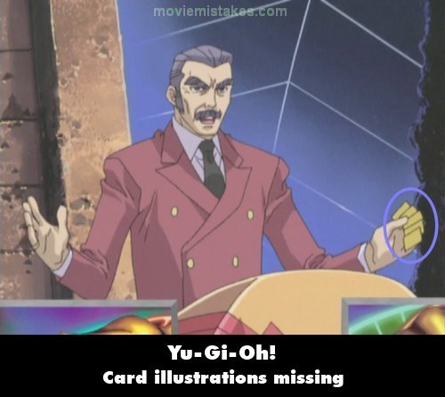 Revealing mistake: When Kaiba tells Gozaburo that he's about to send four pieces of Exodia to the graveyard, Gozaburo asks, "Then what are you waiting for?" and raises his forearms. When he does this, the cards in his hands are missing the illustrations. (00:10:14)
