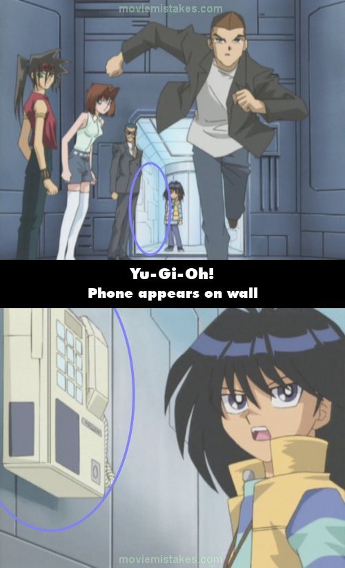 Continuity mistake: When Tristan attempts to leave the tower to tell Serenity about the next duel, Mokuba calls out to him. The wall next to Mokuba has nothing on it, but in the next shot, a phone has suddenly appeared on the wall, which Mokuba then uses. (00:01:51)