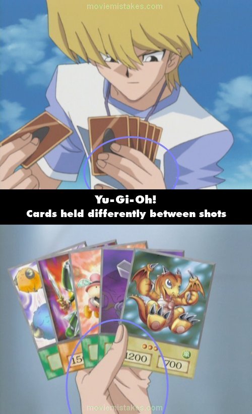 Continuity mistake: On Joey's first turn, after drawing the Alligator Sword card from his deck, he looks at the other five cards in his hand. At first, his hand is at a horizontal angle, but in a close-up of the cards, his hand is at a vertical angle. (00:07:56)