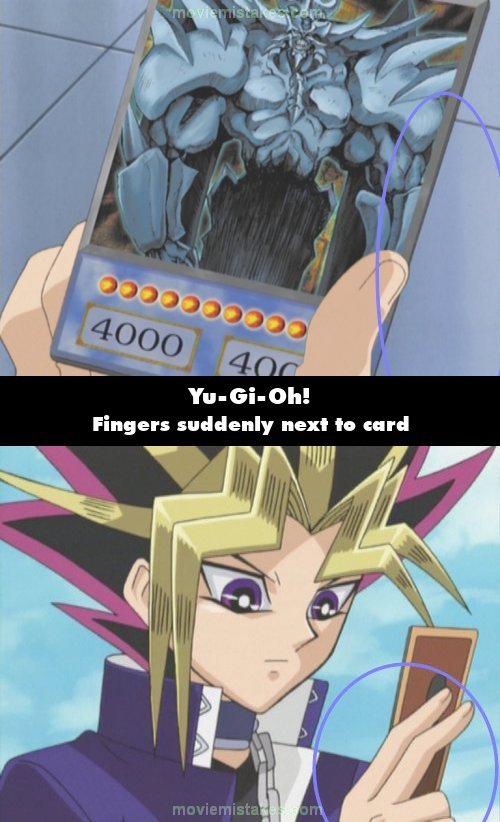 Continuity mistake: When Yugi catches the Obelisk the Tormentor card after Kaiba throws it to him, in the close-up of the card, he has two fingers against the back side. When the shot cuts, the bottom half of those two fingers can be seen on the right-hand side of the card, even though they could not be seen on the right-hand side in the close-up. (00:07:39)