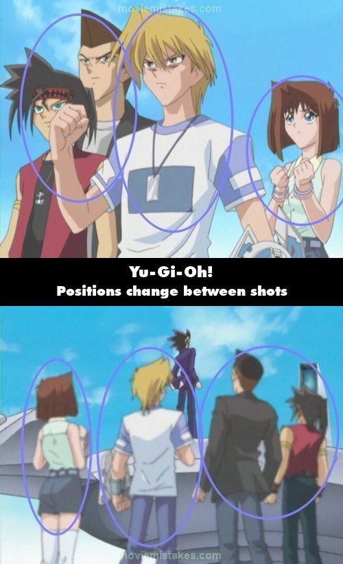 Continuity mistake: When Joey, Tea, Tristan and Devlin are telling Yugi not to let Marik psych him out, Joey is standing in front of the other three and Devlin is standing directly in front of Tristan. When the shot cuts to an angle behind them, Devlin is now in front of Tristan to his right, Joey and Devlin are aligned with one another, and Tea is standing on Joey's left, despite being directly behind him in the previous shot. The positions change back in the following shot. (00:06:22)