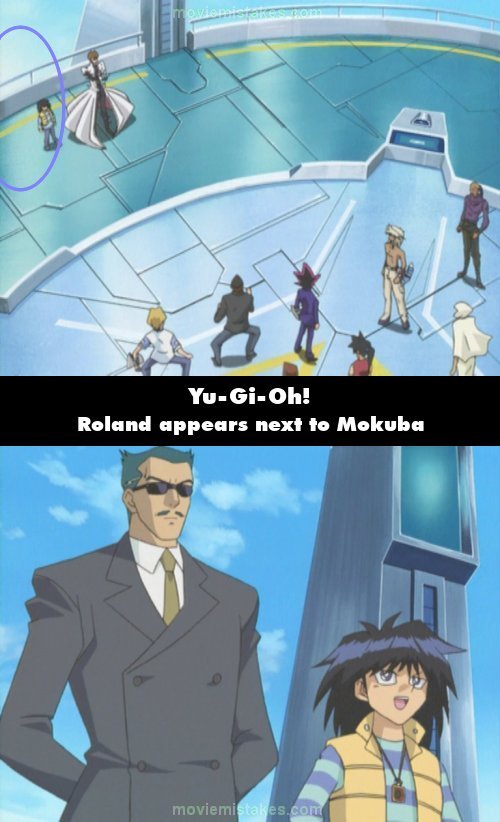 Continuity mistake: After Kaiba has told everyone that the island will explode in one hour, in the wide shot where Kaiba says "I don't kid", he and Mokuba are standing together, with no one else in sight. A few seconds later, when Mokuba says "It's all right now", Roland has suddenly appeared next to him. (00:15:32)