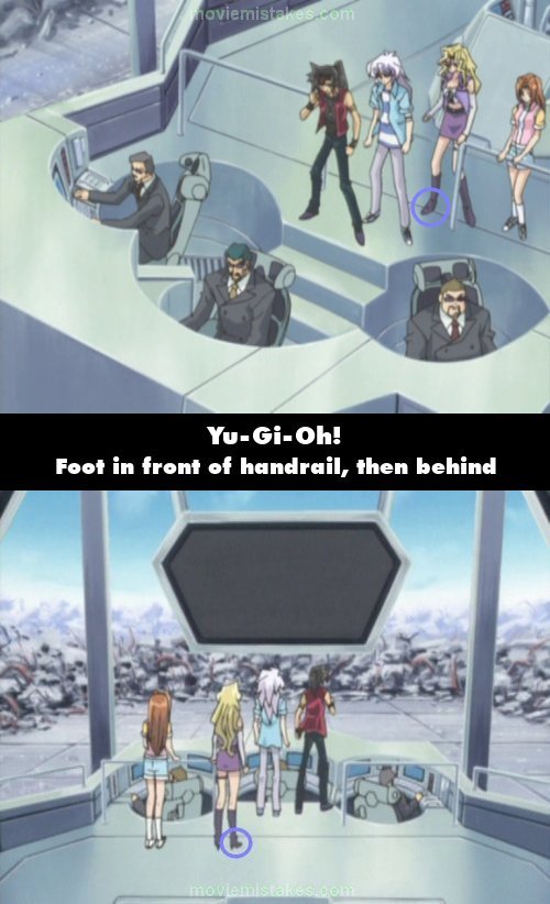 Continuity mistake: When Mai, Serenity, Bakura and Devlin are watching the men in the control room trying to get the engines started, Mai is standing next to a handrail. Her right foot appears to be ahead of the handrail in the wide shot, but when the shot cuts to an angle behind them, her right foot is behind the handrail. (00:03:25)