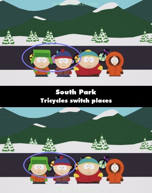 Continuity mistake: When the boys meet Blanket for the first time, note the positions of Kyle and Stan's Big Wheels. After Blanket asks them if they will be his new friends, their Big Wheels have switched places. (00:01:01)