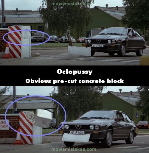 Revealing mistake: As Bond crashes through the air base gate, breaking the chain and the attached concrete block, the pre-cut section of the concrete can be seen.