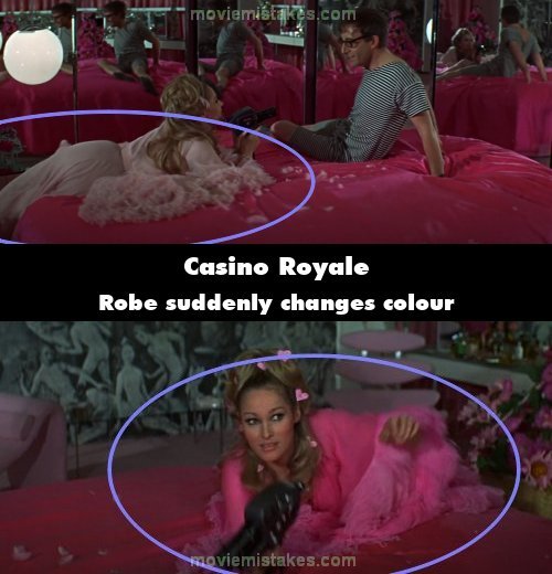 Continuity mistake: When Vesper is lying on the bed taking pictures, her light pink robe suddenly appears dark pink in the very next shot.