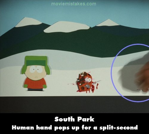Revealing mistake: When Stan walks away from Kyle while saying, "I gotta get a piece of loving while the getting's hot," a blue piece of construction paper briefly appears at the bottom right for a second. At the same time, what appears to be a big and a small shadow briefly appear at the top right for a few frames. Then, after Kyle says, "Rats," a human hand suddenly appears on screen for one frame. (00:13:08)