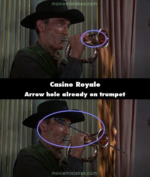 Revealing mistake: During the saloon fight, when a cowboy blows his trumpet, the hole that the arrow later passes through is already visible.
