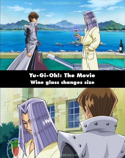 Continuity mistake: When Pegasus is speaking with Kaiba about the card that could defeat the Egyptian Gods, the wine glass he is holding changes its size throughout the scene. (00:13:54)