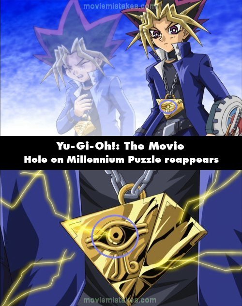 Continuity mistake: After the Pyramid of Light appears on the field, Yugi feels pain inside of him. When this happens, the Millennium Puzzle that he (and the Pharaoh) is wearing is missing the hole on the front side of the puzzle. Then there is a close-up of the Millennium Puzzle where the hole has suddenly appeared. Then in the shot after that, the hole has disappeared again. (00:38:26)