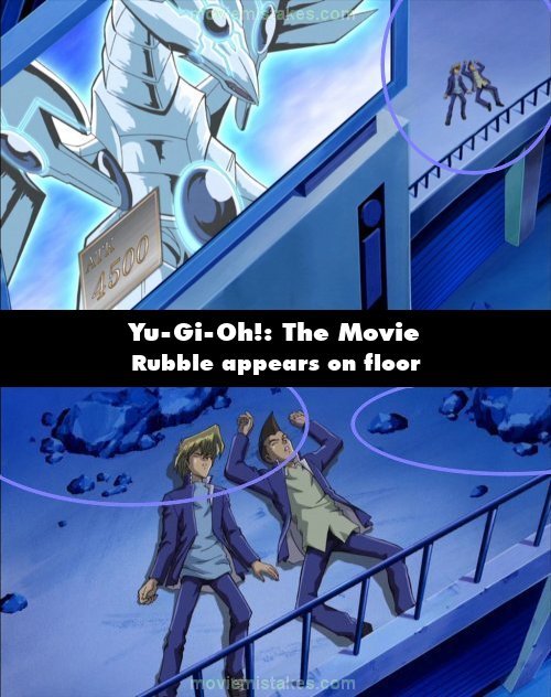 Continuity mistake: When Mokuba sees Joey and Tristan unconscious on the floor, nothing can be seen on the floor surrounding them. It then cuts to a closer shot of the two, where rubble has suddenly appeared on the floor around them. (01:03:21)