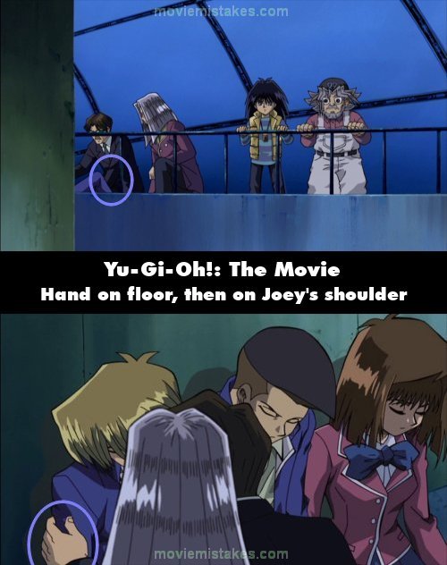 Continuity mistake: When Pegasus is tending to Joey, Tristan and Tea, his aide has his left hand placed on the floor. In the next shot, the aide has his left hand placed on Joey's shoulder so that he can lay him against the wall. (01:04:45)