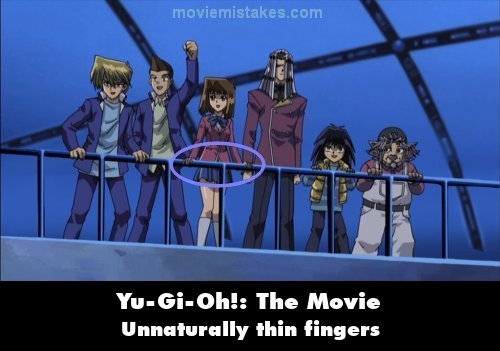 Revealing mistake: After Anubis' last monster has been destroyed, the other main characters begin cheering. Tea has her hands placed on a handrail, but her fingers appear to be unnaturally thin, especially when compared to everyone else's. (01:16:16)