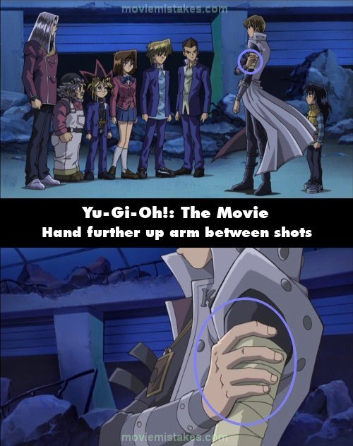 Continuity mistake: When Kaiba walks over to the main characters after Anubis is defeated, his right hand is holding onto bandages wrapped around his left arm. It then cuts to a closer shot of Kaiba where his hand has moved further up the bandages, and his finger can be seen holding onto part of his sleeve. (01:21:26)