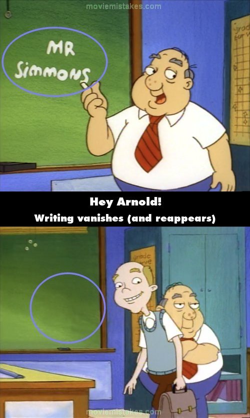 Continuity mistake: New Teacher: At the start, Principal Wartz writes Mr. Simmons' name on the chalkboard. Then, when Mr. Simmons walks over to the desk, the writing is missing from the chalkboard; it reappears a moment later. (00:12:07)