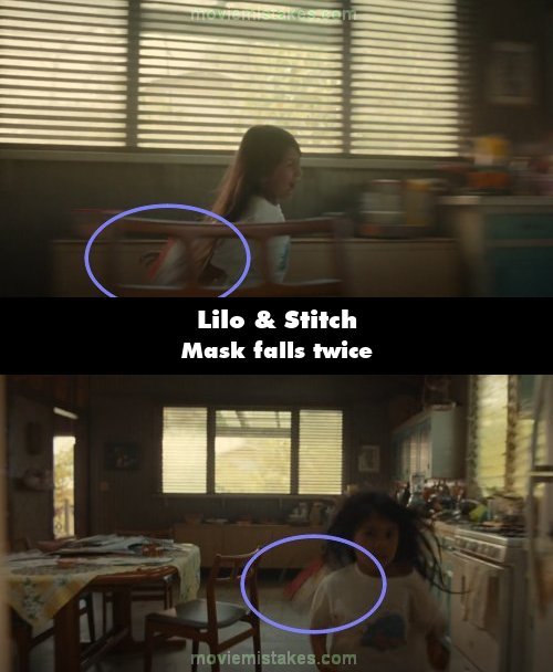 Continuity mistake: Nani chases Lilo, who runs into the house with her mask flying off. The shot cuts to Lilo running past the fridge - and her mask flies off again.