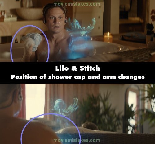 Continuity mistake: Pleakley removes his shower cap, rests it on his shoulder, and watches the hologram. From the opposite angle, both the shower cap and his arm are gone.