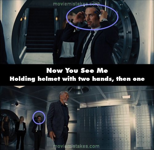 Continuity mistake: After Thaddeus has walked into the fake vault, Dylan asks what was with the helmet. At this moment, Dylan starts to remove the helmet with both hands. Thaddeus then replies, "My fun," and Dylan can be seen in the background removing the helmet with one hand. Then, when the shot cuts to focus on Alma, he is removing it with both hands. (00:36:18)