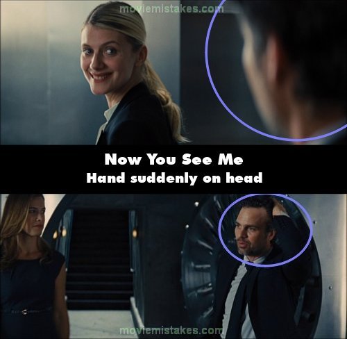 Continuity mistake: When Alma chuckles at Dylan after he removes the teleportation helmet, Dylan can be seen on the right-hand side of the shot. When the shot cuts, he is shown brushing his hair with his left hand, which should have been visible in the previous shot of Alma chuckling. (00:36:21)